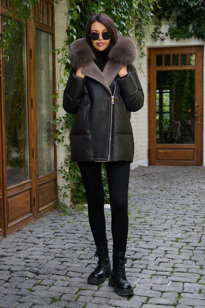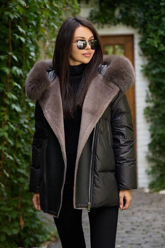 Брендовый пуховик средней длинный в качественной ткани. Застежка - молния, внутри пакет с утеплителем пух. Модель прямого кроя с втачанным капюшоном. Оторочка сделана натуральным мехом песца. Воротник стойка, при желании отстёгивается мех. Хорошо смотрится изделие в спортивном повседневном гардеробе, натуральные материалы позволяют одеть в большие холода зимой 2026 года.