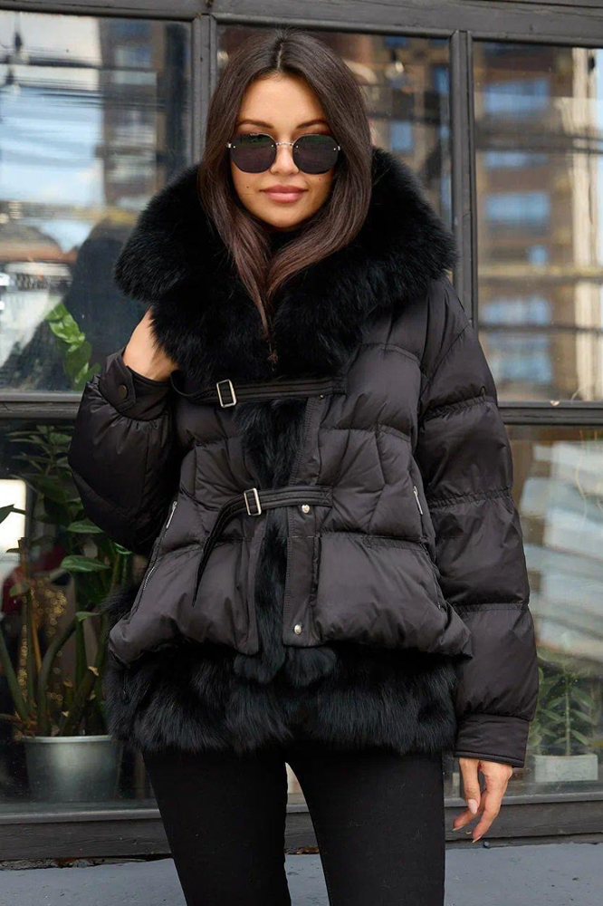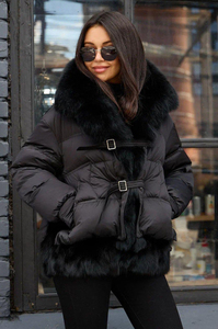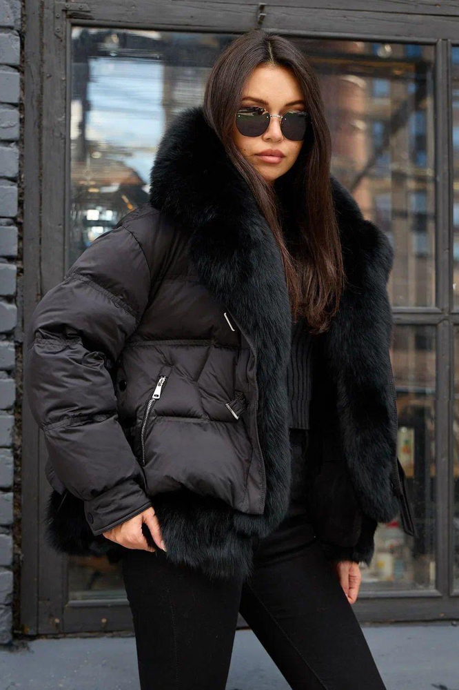 Короткий зимний пуховик сезона 2026 года глубокого черного оттенка с роскошным натуральным мехом песца, украшающим воротник, изнутри и манжету подола. Практичная модель оснащена надежной застежкой с дополнительной защитой в виде кнопок и декоративных элементов-хлястиков. Высококачественная ткань верха устойчива к загрязнениям и влаге, внутренний утеплитель обеспечивает оптимальный микроклимат даже в сильные морозы. Универсальная вещь для городского стиля, подчеркивающая статус владельца и дарящая чувство комфорта и тепла зимой.