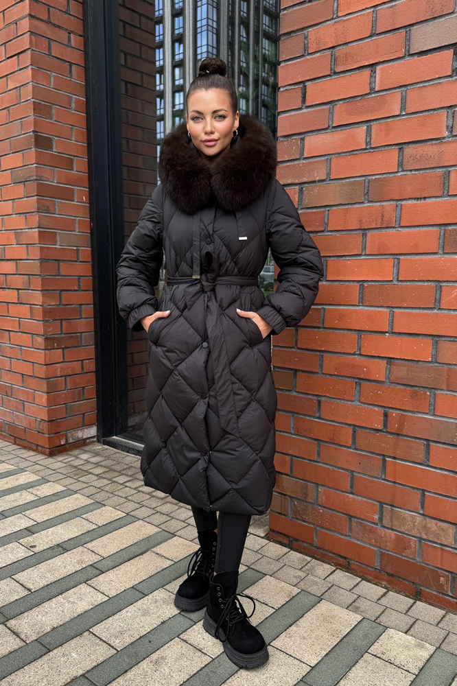 Длинный женский пуховик от бренда Vivilona в классическом чёрном цвете покорит сердца всех поклонников элегантного стиля. Несмотря на большую длину, силуэт остаётся строго очерченным и чётким, что стало возможным благодаря особенностям приталенного кроя. Волшебный природный мех песца, использованный для украшения капюшона, дарит ощущение престижа и роскоши, обогащая внешность особыми чертами характера. Фигурная ромбовидная строчка формирует интересную рельефную структуру, демонстрируя всю уникальность продукта. Любое платье или брюки будут замечательно смотреться в комплекте с данным изделием, поскольку оно способно преобразовать любую женщину в настоящую королеву улицы.