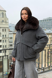 Самый модный шерстяной пуховик сезона 2025-2026 года. Из особенностей можно выделить ткань - кашемир серого оттенка, плотный наполнитель - пух и натуральный мех песца на воротнике. Застегивается изделие на молнию. Боковые карманы втачные с защитой клапанами от снега. Представленная вещь в этом цвете выдержит сильные морозы и прекрасно впишется в женские гардеробы.