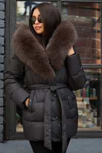 Стильно удлиненный женский пуховик коллекции 2025–2026 в черном цвете с четким приталенным силуэтом, зафиксированным элегантным поясом. Выразительный внешний вид обеспечен богато обработанным меховым английским воротником из пушистого натурального меха песца. Натуральный состав утеплителя — чистый пух и перо — обеспечивают максимальную термоизоляцию и легкость. Это идеальное решение для тех, кто предпочитает сочетать моду и функциональность в своем гардеробе.