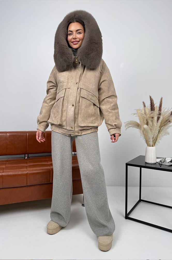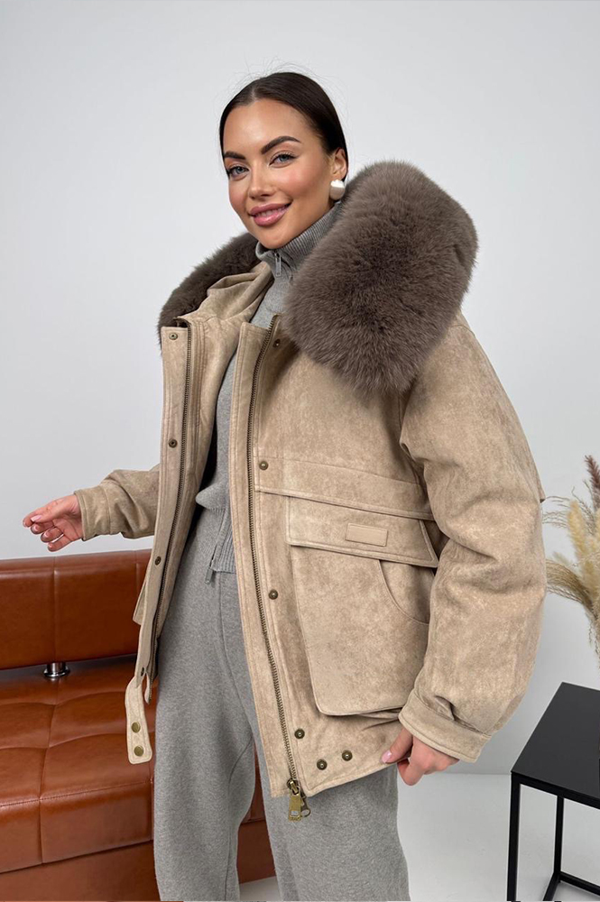 Стильная короткая бомбер-куртка от Pang Million выполнена из качественной эко-замши и утеплена натуральным пухом и пером, что обеспечивает отличную теплоизоляцию. Модель отличается современным фасоном с накладными карманами, широкими рукавами и удобной застежкой на молнию и кнопки. Капюшон украшен мехом песца, добавляя образу изысканности и уюта. Такая куртка прекрасно подойдет для холодной погоды, сочетая стиль и функциональность.