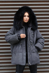 Шерстяной зимний пуховик с мехом енота