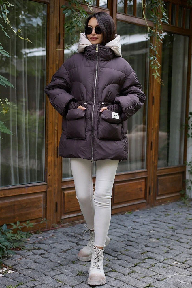 Женский пуховик PANG MILLION коллекций 2025–2026 — теплое и стильное предложение для межсезонья и зимы. Материал и крой демонстрируют высокое качество и тщательную проработку деталей. Глубокий винный оттенок основного полотна создает настроение и выражает индивидуальность обладательницы. Подчеркнутый акцент на плечи и верхнюю зону формируют мягкие формы, созданные благодаря наличию широкой стойки-воротника с элегантной тонкой бейкой, плавно переходящей в широкие плечи и широкие вертикальные полосы на груди. Для максимальной тепловой изоляции предусмотрен объемный съёмный капюшон с плотной регулируемой затяжкой. Внутри пуховика предусмотрена дополнительная шейная манишка, увеличивающая комфорт и защиту от холодного ветра. По бокам расположены два больших удобных карманчика с клапанами. Декоративные складочки на рукавах завершают визуализацию всего ансамбля, гармонично сочетающегося с общим стилем и красотой каждой девушки.
