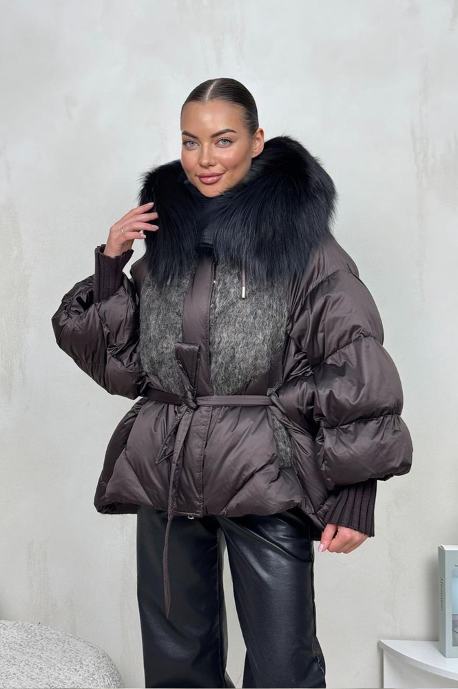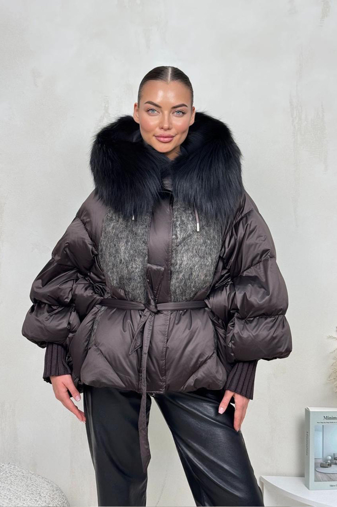 Удлиненное пуховое пальто бренда Tomas Bieber для зимы 2025-2026 годов. Мех чернобурки украшает воротник. Внутри — утеплитель из пуха и пера. Фасон в стиле юбки с поясом на талии подчеркивает силуэт. Стильное и теплое решение для холодных зим.