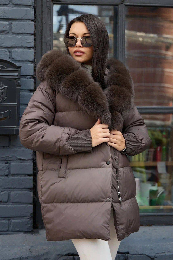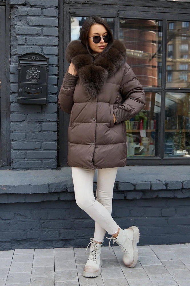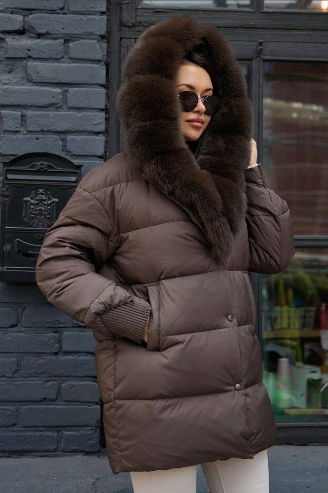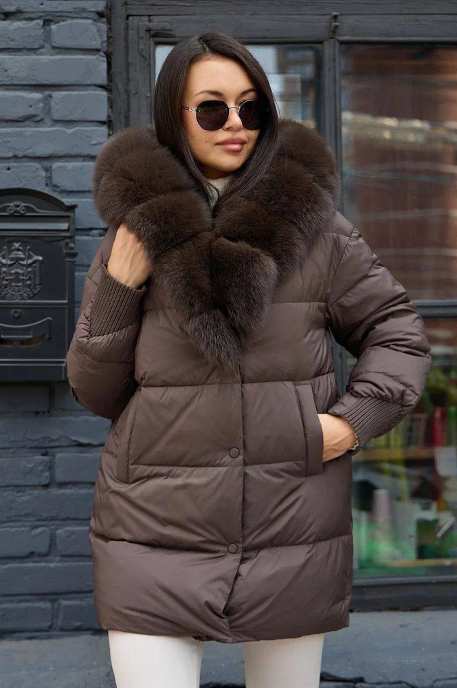 Удлинённый женский пуховик коричневого цвета с мехом песца на капюшоне и широким отложным воротником. Модель оснащена застёжкой на молнию и кнопки, рукава дополнены тканевыми манжетами для дополнительного комфорта и защиты от холода. Идеальный выбор для стильного и тёплого образа в холодное время года.