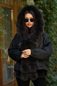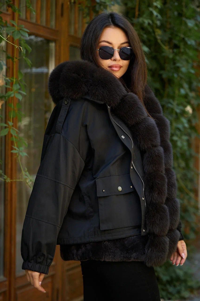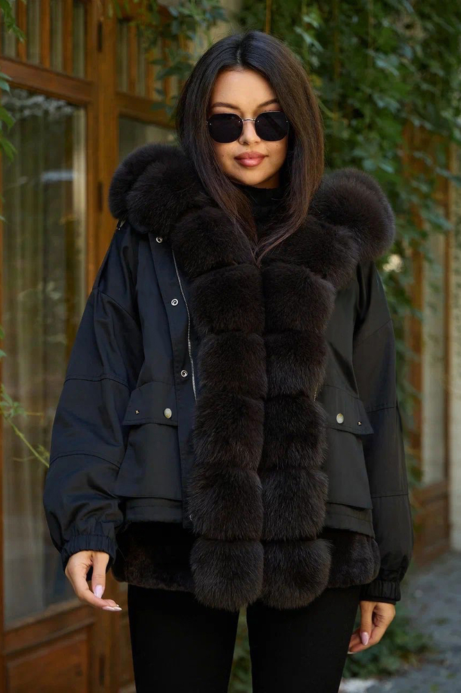 Элегантная женская пуховая парка с мехом песца на капюшоне и вдоль молнии — идеальный выбор для холодных дней. Стильный дизайн дополняет декорированный мехом кролика подол, придавая образу изысканность. Куртка застегивается на надежную молнию и кнопки, обеспечивая комфорт и тепло. Два удобных накладных кармана спереди позволяют хранить мелкие вещи или согреть руки. Выполнена в классическом черном цвете, утеплитель из пуха и пера обеспечивает отличную теплоизоляцию. Эта парка отлично подойдет для тех, кто ценит стиль и функциональность в холодную погоду.