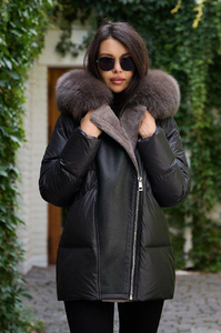 Брендовый пуховик средней длинный в качественной ткани. Застежка - молния, внутри пакет с утеплителем пух. Модель прямого кроя с втачанным капюшоном. Оторочка сделана натуральным мехом песца. Воротник стойка, при желании отстёгивается мех. Хорошо смотрится изделие в спортивном повседневном гардеробе, натуральные материалы позволяют одеть в большие холода зимой 2026 года.