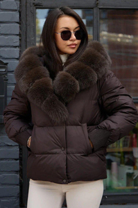 Женский коротенький пуховик прямого покроя на зимний период 2025–2026 годов привлекает внимание своим современным дизайном и деталями. Верхнее покрытие пуховика выполнено в сдержанном стиле, а объёмный капюшон украшают большие натуральные меховые элементы. Вязанные декоративные вставки придают рукаву особенную фактуру и уют. Надежная защита обеспечивается комбинированной системой застежки — основная молния дублируется функциональными металлическими кнопками. Модель отлично подойдёт любительницам многослойных и уютных зимних луков.