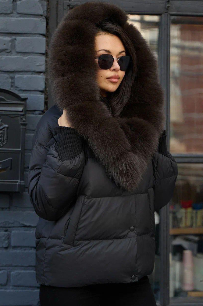 Теплый женский пуховик Vivilona короткого формата на зиму 2026 года представляет собой оригинальную модель с просторным меховым капюшоном, щедро отделанным дорогим мехом песца. Наряду с оригинальным верхним слоем ткани, дизайнеры добавили стильные вязаные вставки на рукавах, привнося нотку рукодельного шарма и дополнительного тепла. Наполнение изделия состоит из теплого и легкого натурального пуха и пера, поддерживая идеальный баланс между легковесностью и надежностью защиты от морозов. Эта модель обязательно понравится поклонницам эксклюзивного дизайна и высокой степени теплозащиты.