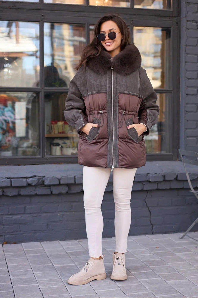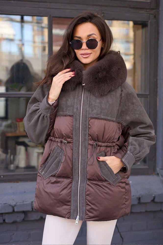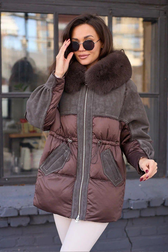 Дутое пуховое пальто с мехом песца на капюшоне. Модель оверсайз по спине и приталенная по переду, создающая стильный и комфортный силуэт. Внутри наполнено пухом и пером для максимального утепления. Оснащено накладными карманами и трикотажными манжетами на рукавах для защиты от холода. Идеально подходит для холодной погоды, сочетая тепло, уют и современный дизайн.