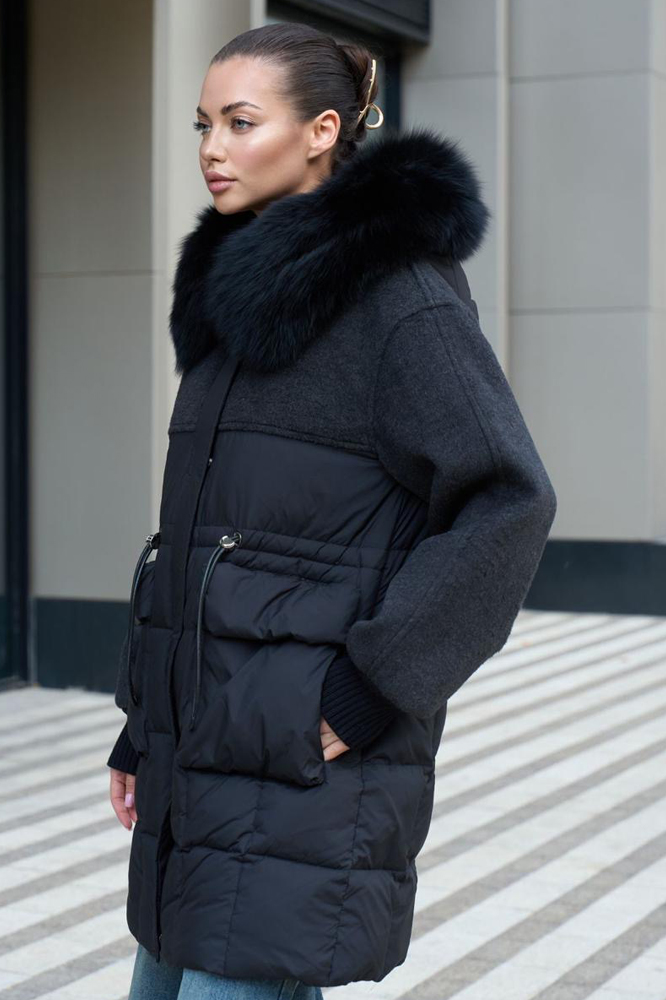 Стильный женский комбинированный пуховик Bogner черного цвета с шерстяными вставками на спине и плечах. Модель украшена накладными карманами и тесьмой на талии для подчеркивания силуэта. Наполнитель — пух и перо, а капюшон украшен мехом песца, что обеспечивает тепло и роскошный внешний вид.
