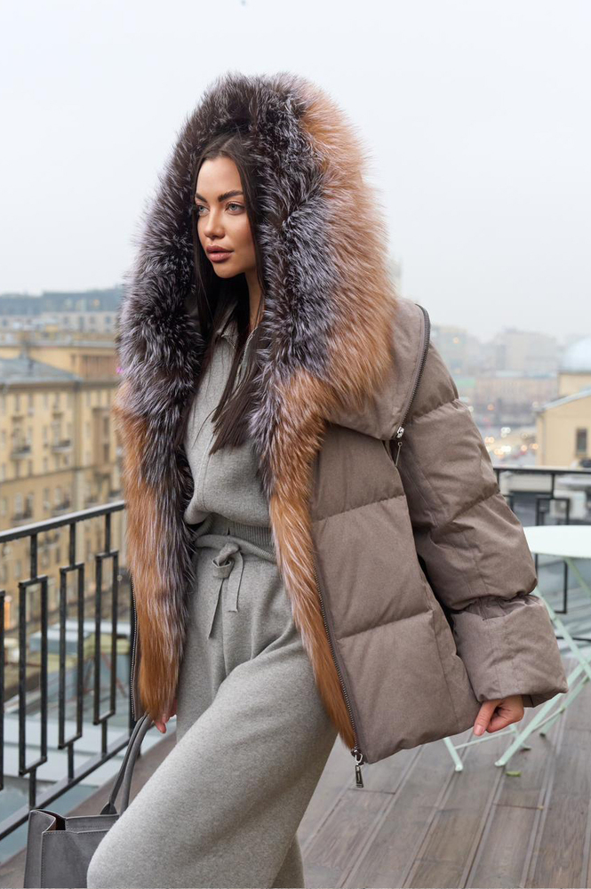 Пуховая куртка Tannossto с мехом чернобурки внутри, вдоль молнии и на капюшоне. Утеплитель из пуха и пера обеспечивает теплоту. Объемный оверсайз-крой и втачные карманы делают стильной и практичной. Застежка — молния.