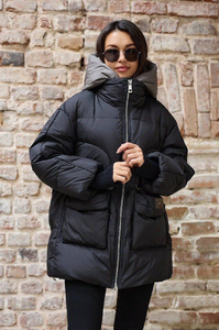 Пуховая зимняя куртка Pang Million выполнена в свободном крое, что обеспечивает комфорт и свободу движений. Куртка оснащена внутренней манишкой, которая дополнительно защищает от холода. Контрастный капюшон придает изделию яркий акцент и стильный вид. Накладные карманы добавляют практичности и удобства. Застежка выполнена на молнии и кнопках, что обеспечивает надежную защиту от ветра и холода. По переду расположены тесемки на талии, позволяющие регулировать посадку и подчеркивать силуэт. Цвет куртки — насыщенный черный, что делает ее универсальной и легко сочетаемой с различной одеждой. Эта пуховая куртка отлично подойдет для зимних прогулок и повседневной носки в холодное время года.