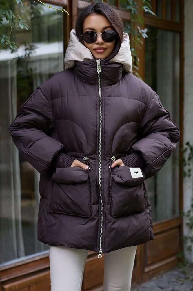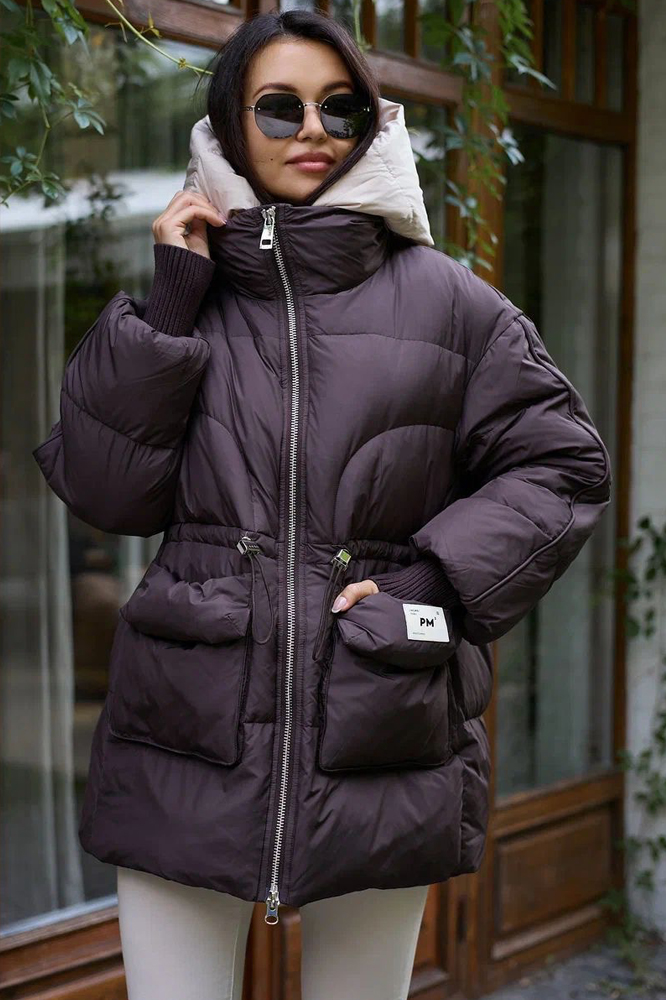Женский пуховик PANG MILLION коллекций 2025–2026 — теплое и стильное предложение для межсезонья и зимы. Материал и крой демонстрируют высокое качество и тщательную проработку деталей. Глубокий винный оттенок основного полотна создает настроение и выражает индивидуальность обладательницы. Подчеркнутый акцент на плечи и верхнюю зону формируют мягкие формы, созданные благодаря наличию широкой стойки-воротника с элегантной тонкой бейкой, плавно переходящей в широкие плечи и широкие вертикальные полосы на груди. Для максимальной тепловой изоляции предусмотрен объемный съёмный капюшон с плотной регулируемой затяжкой. Внутри пуховика предусмотрена дополнительная шейная манишка, увеличивающая комфорт и защиту от холодного ветра. По бокам расположены два больших удобных карманчика с клапанами. Декоративные складочки на рукавах завершают визуализацию всего ансамбля, гармонично сочетающегося с общим стилем и красотой каждой девушки.