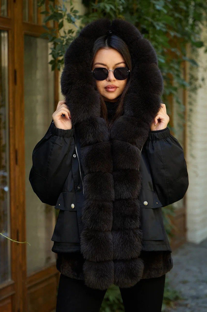 Элегантная женская пуховая парка с мехом песца на капюшоне и вдоль молнии — идеальный выбор для холодных дней. Стильный дизайн дополняет декорированный мехом кролика подол, придавая образу изысканность. Куртка застегивается на надежную молнию и кнопки, обеспечивая комфорт и тепло. Два удобных накладных кармана спереди позволяют хранить мелкие вещи или согреть руки. Выполнена в классическом черном цвете, утеплитель из пуха и пера обеспечивает отличную теплоизоляцию. Эта парка отлично подойдет для тех, кто ценит стиль и функциональность в холодную погоду.